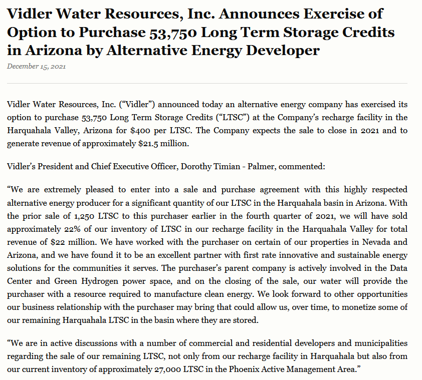 There are other interested parties. In the press release Vidler said “we are in active discussions with a number of commercial and residential developers and municipalities regarding the sale of our remaining LTSC, not only from our recharge facility in Harquahala but also from our current inventory of approximately 27,000 LTSC in the Phoenix Active Management Area.”