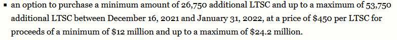 But this sale reassures me. The sale is for a material amount of credits (53,750 LTSCs, or 21% of the total) and the price tag is higher than I had been anticipating back in June (I figured $350/LTSC – this sale went through at $400/LTSC). I believe there is also the opportunity for another sale (the original press release gave a second option, see below), by end of January.