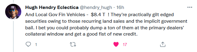 Here’s the thing about the LGFVs. They have a shitload of debt. And I mean a shitload. Here is where Hendry almost assuredly got his number from: