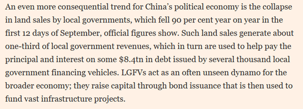So there is all this debt outstanding at the local and regional levels. It is kept afloat by land sales. But land sales are collapsing because the big developers like Evergrande have been squeezed and are in trouble.