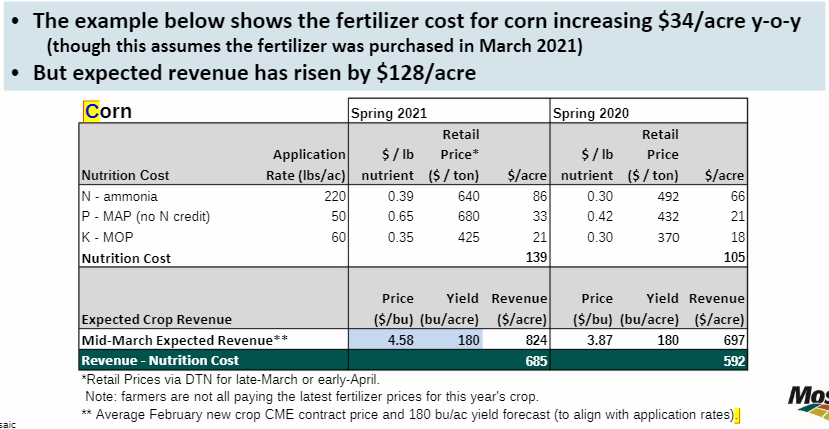 Simply put, the bull case is – yes fertilizer prices are up but grain prices are up even more! And you presumably should get a better yield per acre with better fertilizer application.