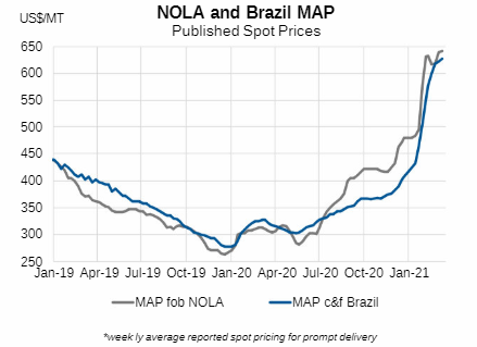 Mosaic’s revenue from phosphate this year is, so far, significantly above last year. February revenue was $297 million vs $172 million in 2020. January revenue was $337 million versus $198 million. This does not include the Brazil operations, where sales were roughly flat yoy.