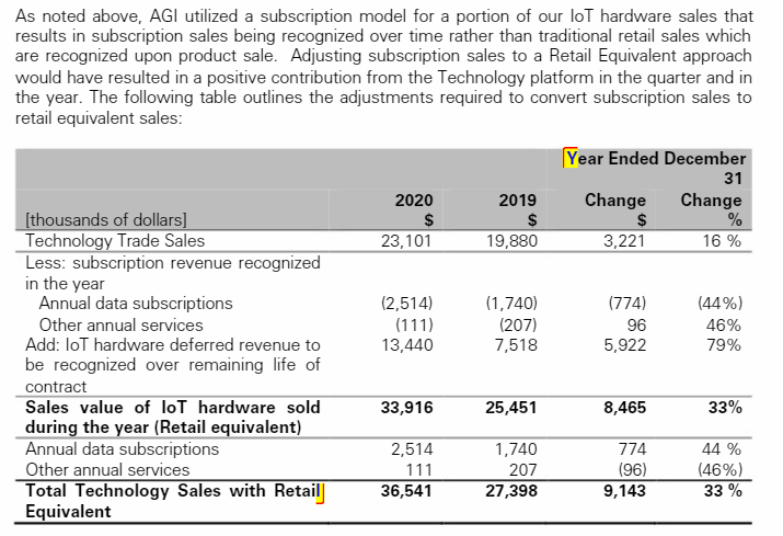 Now there is a question of how much SureTrack is really a SaaS business. AFN sells the IoT hardware and the subscription. The hardware currently makes up most of AFN’s revenue. The company breaks down the revenue buckets in their MD&A where they reconcile their “Retail Equivalent” revenue with the actual revenue that they are allowed to book.
