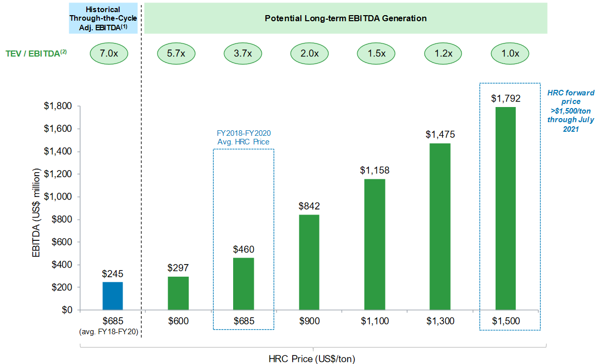On the call Stelco management said that if they generated $2 billion of EBITDA, that will convert to $1.4 billion of free cash. Stelco has an EV of about $2.9 billion right now.