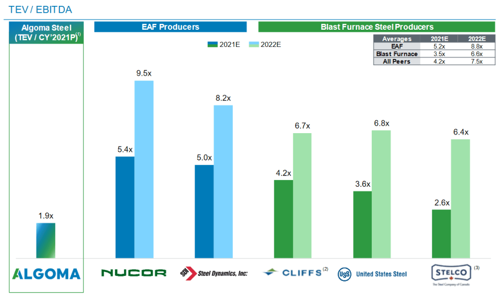 Algoma is also getting a cash injection that they plan to use to build out an EAF furnace. EAF steel makers use scrap instead of iron pellets and coking coal to make steel. They trade at larger multiples – Nucor, the biggest EAF steel producer in North America, gets a crazy 8x PE multiple!