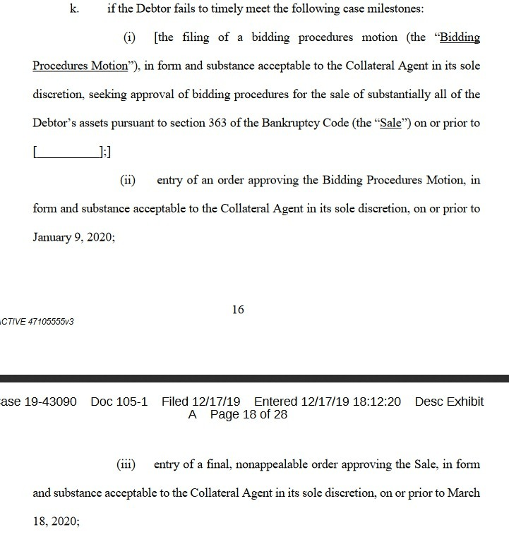 The one other thing relevant thing that has been settled is the schedule. It looks like the process will take place quickly. The plan is to have bidding procedures approved by January 9th. The auction should be complete by March 18th: