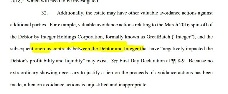One other interesting point is that Nuvectra came out with their list of executory contracts they wanted to reject. Integer/Greatbatch wasn’t among them. Also, in a separate document intended to list the contracts to be retained, there was no mention of Integer/Greatbatch either.