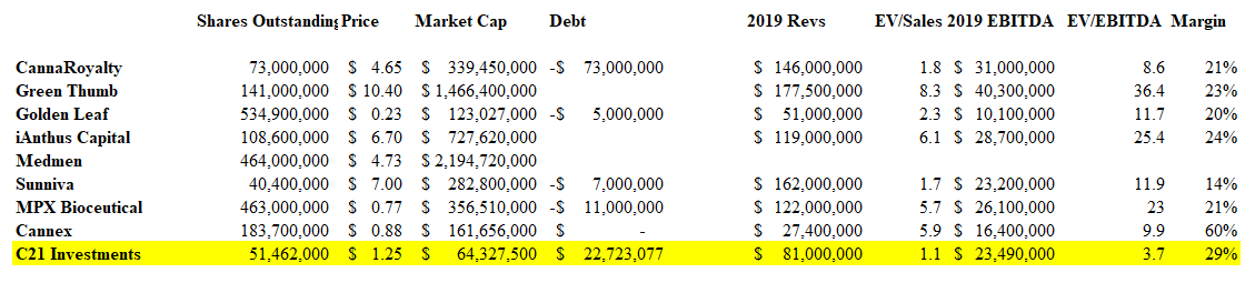 Below is a comparison using 2019 projections for each company. For the other companies in the list I’ve found brokerage coverage (in most cases Canaccord but also GMP and Beacon Securities) for the revenue and EBITDA estimates. C21 is my own estimate which is primarily based off of the company’s own projections.