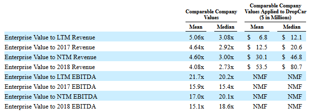 But here’s where it gets really interesting. In the merger prospectus Gordian performed a similar competitive valuation analysis for DropCar to what I showed earlier with WPCS. Here is the valuation table they came up with: