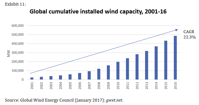 Given that wind is now cheaper than gas turbines in many locations wind installation is forecast to continue to grow, at 11.5% CAGR, over the next 30 years. The following is a near term capacity growth estimate from the Global Wind Energy Council: