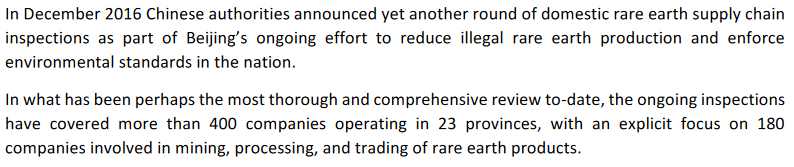 Illegal mining of rare earths is profitable because it is polluting and harmful to the environment. As part of the governments efforts to stem pollution, China is cracking down on illegal mines. The following is from this Adamis Intel note: