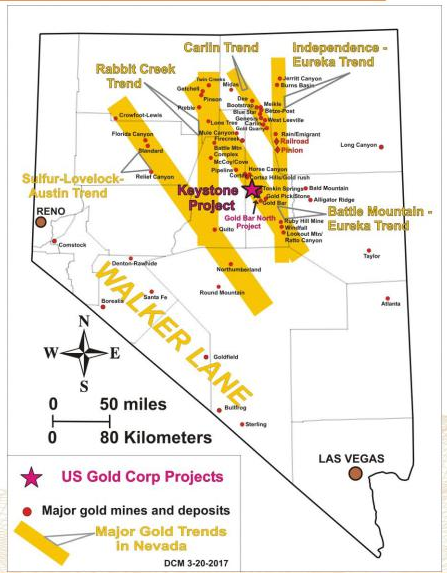 US Gold has two assets. The first, what you would call the flagship asset, is called Keystone. Keystone is very similar to what Mathewson started with at Railroad. Its located in Nevada along one of the major fault trends (called the Cortez Gold trend) about 10 miles south of the Barrick Cortez Hills mine. It is in the middle of a number of elephant deposits, along a major fault and close to other faults. This map of Nevada, from the company’s presentation, shows where Keystone is in relation to other discoveries and mines.