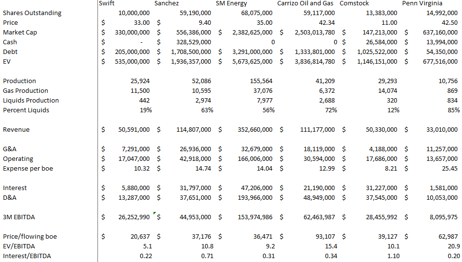 Perhaps the closest comparison is Comstock Resources. Comstock is gas weighted, has Eagle Ford land in the same counties as Swift (McMullen and LaSalle counties) but also has a lot of gassy acreage in the Haynesville. Comstock trades at twice the valuation of Swift, based on both flowing boe or EBITDA.
