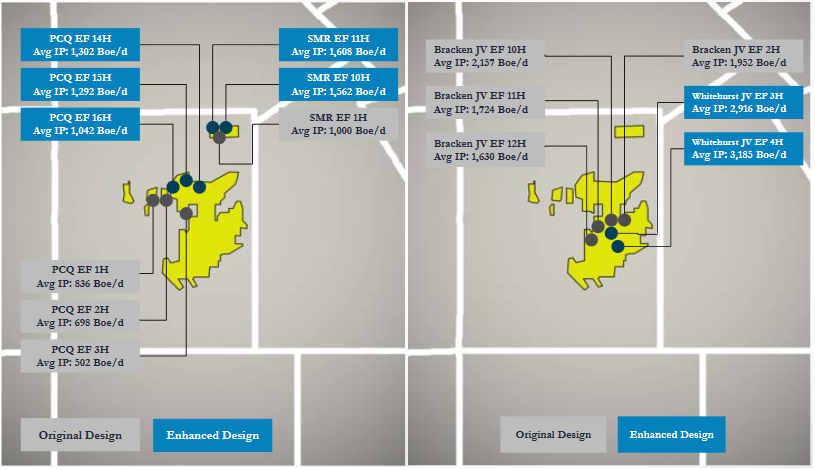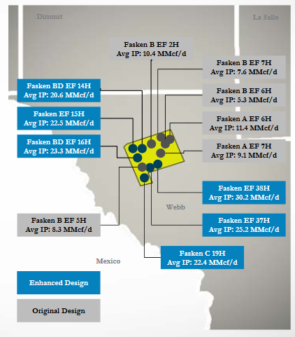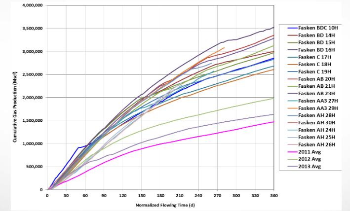 This shift to gas is because of the Fasken acreage. In 2014 the company made changes to their completion techniques at Fasken and achieved a dramatic improvement in their results. Below are well results before and after.