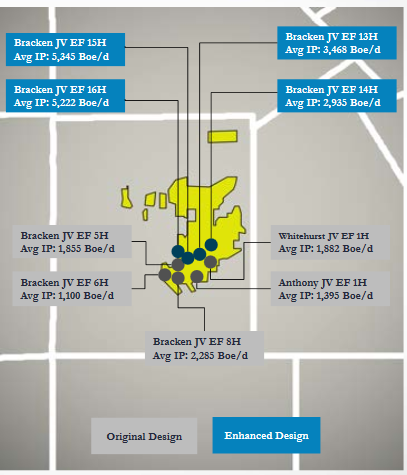 The PCQ wells are typically 90% oil while the Northern Bracken/Whitehurst wells are around 50% condensate. In the south Bracken where it is gassy, Swift has had success not far different from Fasken, with Bracken wells IP30s exceeding 5,000boepd and cumulative production that looks like it will exceed 2BCF in the first year. Below are IP30’s from this area: