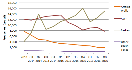 Artesia has seen no drilling activity for the last couple of years and the wells in the area have been declining naturally. In 2015 the company drilled and completed only one well at AWP and so the decline there is close to natural. The flattening of production in the first and second quarter at AWP coincides with the 4 well completions during that time. Fasken saw the majority of activity in 2015, followed by a lull in the first quarter of 2016 and a corresponding drop in production that recovered once the 8 new wells were completed in the second and third quarters.