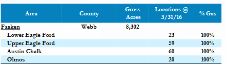 At our Fasken field in the Eagle Ford play, eight wells were placed into the system during the first nine months of 2016. Seven wells were placed into the system at rates between 15 – 20 MMcf per day of natural gas and one well had mechanical issues and was placed into the system at a restricted rate of 9 MMcf per day of natural gas. The Company resumed drilling operations at Fasken in October 2016 and expects to drill four wells by the end of the year. These four wells are expected to come online in early 2017.