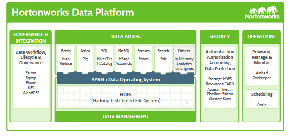 Below is the Hortonworks data platform. It consists of HDFS, a number of data access tools including MapReduce, and then supporting tools that let you manage, govern and support that data. Some of these tools (like YARN) were developed by Hortonworks, while others were developed by other Apache members (like MapR and Cloudera).