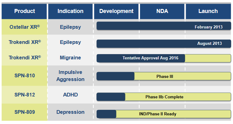 The drug pipeline consists of two drugs in later stages of development, SPN-810 and SPN-812. Both are being trialed for children, the former for impulsive aggression and the latter for ADHD.