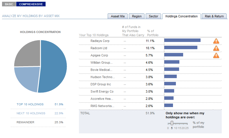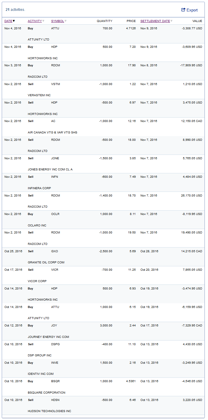 I had a pullback in the last month.  I guess it shouldn’t be unexpected.  The previous three months were almost parabolic.  Having a portfolio that is weighted only to a few stocks, any kind of lull in the performance of those stocks can cause big fluctuations.  Right now my portfolio is heavily dependent on the performance of Radcom and Radisys. Both stocks had corrections leading into and following their third quarter earnings.