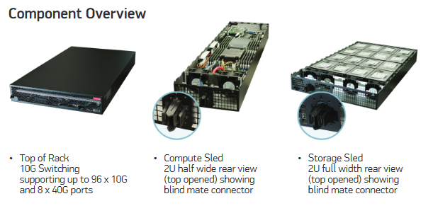 The hardware is mostly off the shelf. It includes switching, compute and storage sleds though some proprietary hardware may still be required for more complex use cases.