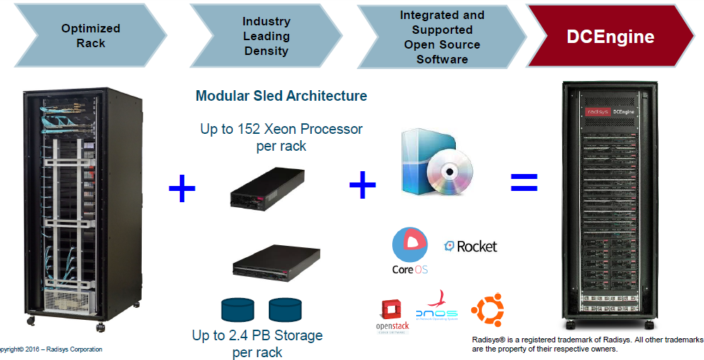 DCEngine has the most revenue potential of the 3 products. DCEngine is also the most straightforward of Radisys’s offerings to talk about. It’s basically a rack populated with white box hardware. This presentation, given at the July CORD summit, provided a nice illustration of what the rack is: