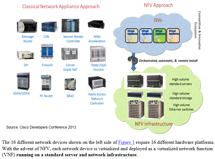 NFV decouples hardware from software. Rather than purchasing proprietary hardware/software packages to fill specific tasks (and getting pigeon holed under a single vendors product umbrella), communication service providers (CSPs) can populate their central offices with off the shelf “white box” equipment. Software functions will be “virtualized”, installed and deployed off of the generic hardware as required.