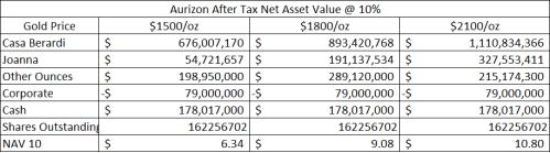 - Aurizon is fairly priced in the $6-$8 range if you believe in $1500/oz gold for the long term. Aurizon needs to move well into the double digits to begin to price in $2000/oz plus gold.