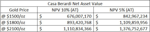 Like Casa Berardi, I looked at 3 gold price scenarios; the trailing four quarter gold price ($1500/oz), the current gold price $1800/oz, and a future possible rise in the gold price ($2100/oz). Below is the before tax NPV of Joanna under each scenario.