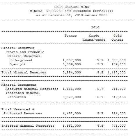 As with Casa Berardi, any M+I or inferred resource not included in the production profile will be given a valuation based on a per ounce estimate.
