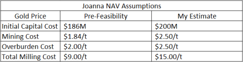 My analysis tries to incorporate this new on-site milling. The mining and base milling assumptions were determined from the pre-feasibility study that was done for Joanna December 22nd 2009. However I updated a number of the capital and operating cost numbers to better reflect both the cost increases, the mill on-site, and to add some conservativeness. The differences are listed below: