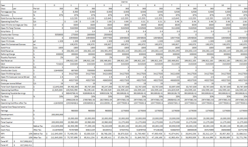 The details of the spreadsheet I used to come up with the estimates is provided below. The cost and processing assumptions are almost exclusively based on the Roscoe Postive report. The grades of the underground are based on the grades expected from the mine sequencing of the current reserves, and the stated grade of the M+I resource. Open pit grades are from Roscoe. Taxes are determined based on a 30% tax rate (includes provincial and federal tax) with depreciation deducted from the before tax income.