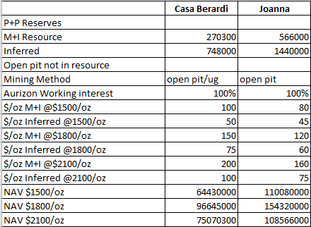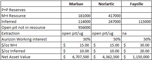 Because these projects are still years away from a feasibility type study, and because they represent a very small value in comparison to Casa Berardi and Joanna, I have chosen to value them on a very simple $/oz basis. In the case of Marban, as part of the earn in Aurizon has to pay $30/oz M+I and $20/oz inferred for 50% of the ounces defined in the final NI 43-101. That is why I have assigned a lower value to ounces in the Marban-Norlartic deposits.