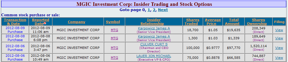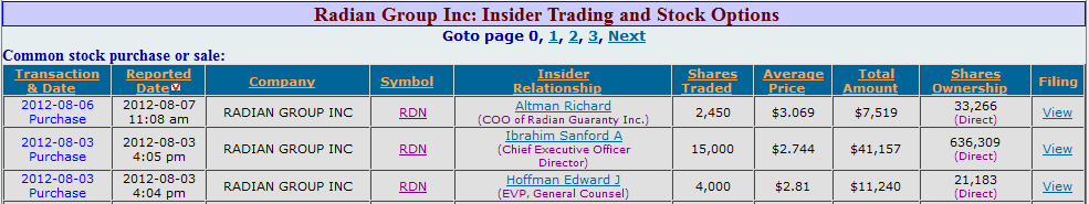 On one last note, I was encouraged to see that both Radian and MGIC management bought shares over the past few weeks (with MGIC being the more important of the two in this respect). These purchases, which are not insignificant and show that management has not thrown in the towel yet.