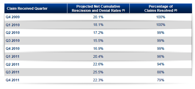 For example, if the number of claims resolved is 100%, as it is for Q4 2009 and Q1 2010, then the Projected Net Cumulative Rescission and Denial Rate has been determined completely from the actual finalized settlement of claims.  To the extent that the percentage of claims resolved is less than 100%, the Projected Net Cumulative Rescission and Denial Rate may still change as the remaining claims are resolved.