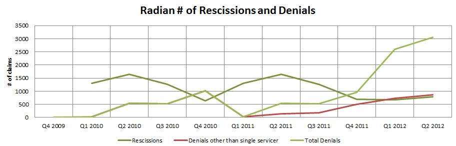 The above chart is similar to the one I showed earlier.  It illustrates the number of rescissions and denials at Radian by quarter, but with the difference that now the denial activity has been broken out a bit further.  Beginning with the Q2 2011 quarter, Radian further delineated its denials between those that have come from a single servicer, and those that have come from everyone else.