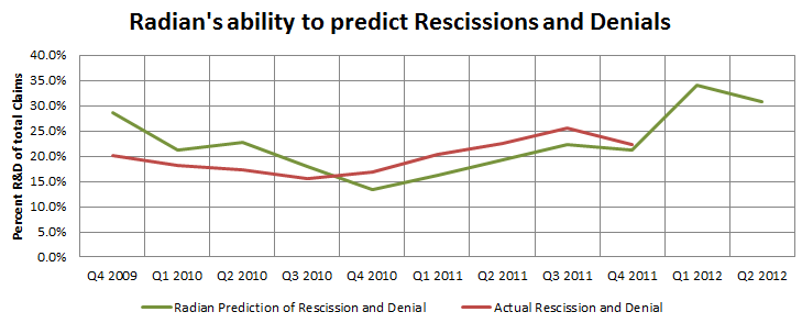 I don’t know the answer to that, and we won’t get better visibility until the next quarter when Radian provides their actual rescission and denial to total claim rate percentage.  Until that time, what we can say is that based on the data so far, it appears the assumption is on target.  The one quarter we can look at is the Q4 2011 quarter, which was when the trend of higher single servicer denials really began to take off.  And for that quarter, Radian looks to have predicted eventual rescission and denial rates fairly well.   Go back to the chart labeled “Radian’s ability to Predict Rescissions and Denials” and note that for Q4 2011, actual rescission and denial rates have been slightly higher than predicted.  And this is with 79% of total claims resolved, so its not a small sample size.