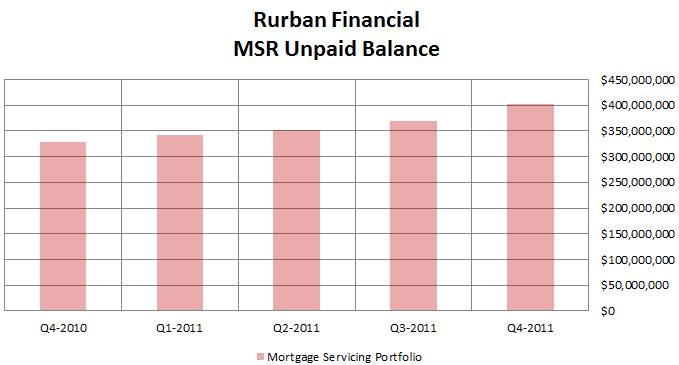 Rurban took a beat down because of the valuation adjustment that they had to make to the MSRs that they hold. The valuation adjustment for the full year 2011 was $1,119,000. That works out to 0.22 per share of before tax earnings. Rurban reports the MSR adjumstent within its “core earnings” calculation, so it does not get ignored as is the case for some of the other mortgage servicers like PHH. I’m not sure why they don’t “ex” it out of core earnings. Its a somewhat bogus accounting requirement in my opinion. If an asset can be adjusted up or down 25% in a single year is than you have to question the valuation period.
